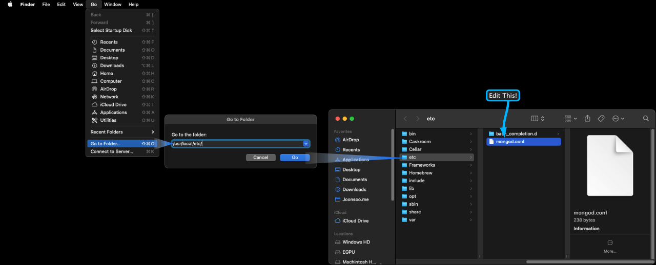 - Intel MacOS의 경우 /usr/local/etc/mongod.conf 파일을 수정하면 된다.